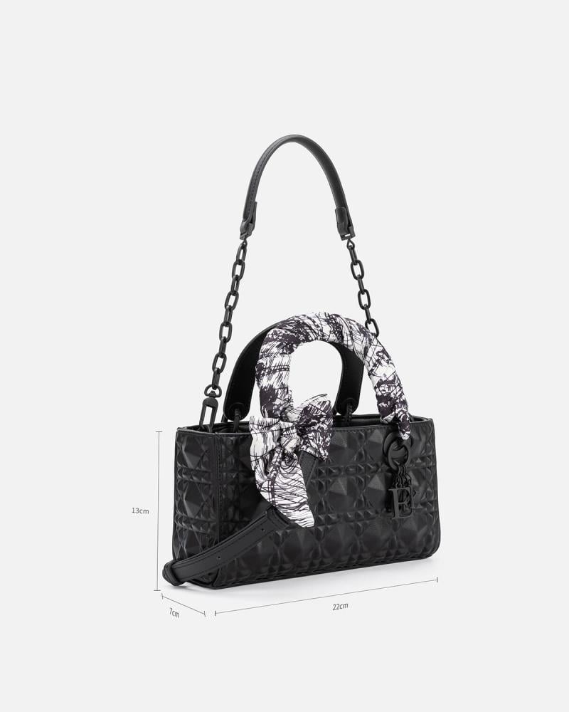 • وصف الشنطة : شنطة نسائية من الجلد باللون الأسود مع يد مقوسة تتزين بوشاح فاخر وحزام إضافي لتنعمي بحرية إختيار الطريقة المناسبة لحمل الشنطة