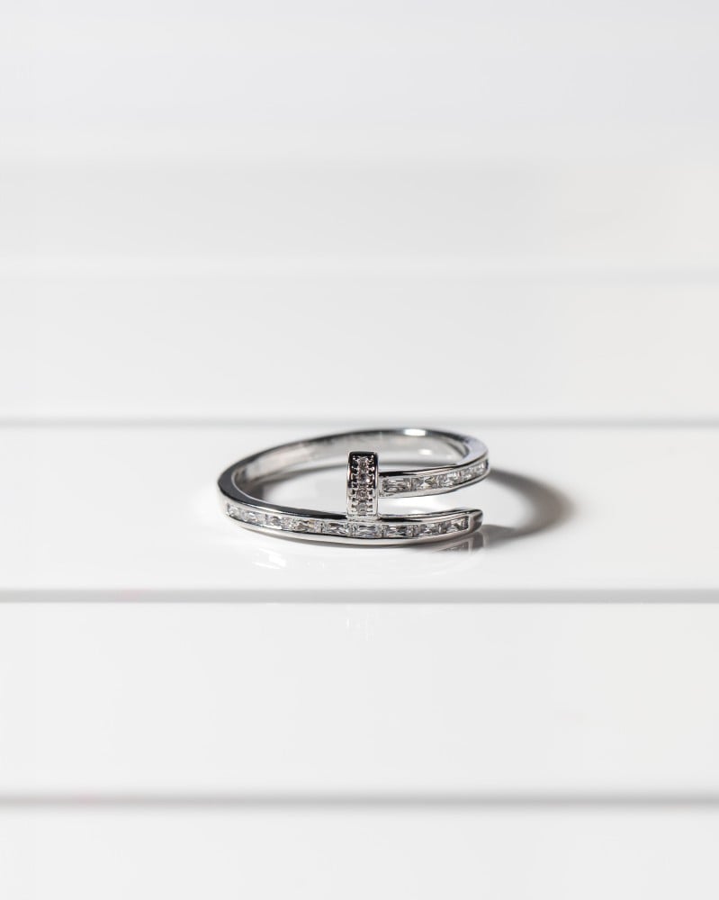 خاتم نسائي بتصميم كلاسيك باللون الفضي، خاتم بتصميم متداخل يتزين بفصوص من الزركون اللامع ، اضيفي لمسه أنثويه راقيه الى طلتك مع هذا الخاتم ، خاتم يناسب إطلالتك المسائية .