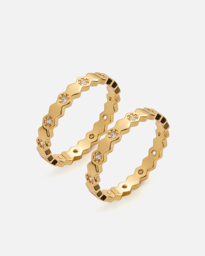 خاتم توينز نسائي بتصميم عصري باللون الذهبي ,خاتمين بتصميم أنيق وبفصوص زركون براقه تزين الخاتم ، خاتم يضفي لمسة أناقة على إطلالتك المسائية .